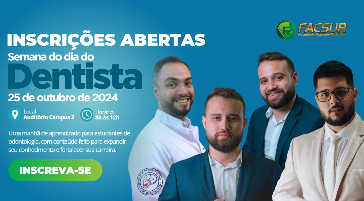 Em celebração ao Dia do Cirurgião-Dentista, a Faculdade Supremo Redentor convida todos os estudantes e professores de odontologia para a II Semana de Odontologia, que ocorrerá no dia 25 de outubro de 2024. Esse evento especial proporcionará uma manhã repleta de aprendizado, troca de experiências e conhecimento sobre as mais recentes atualizações na área odontológica.
